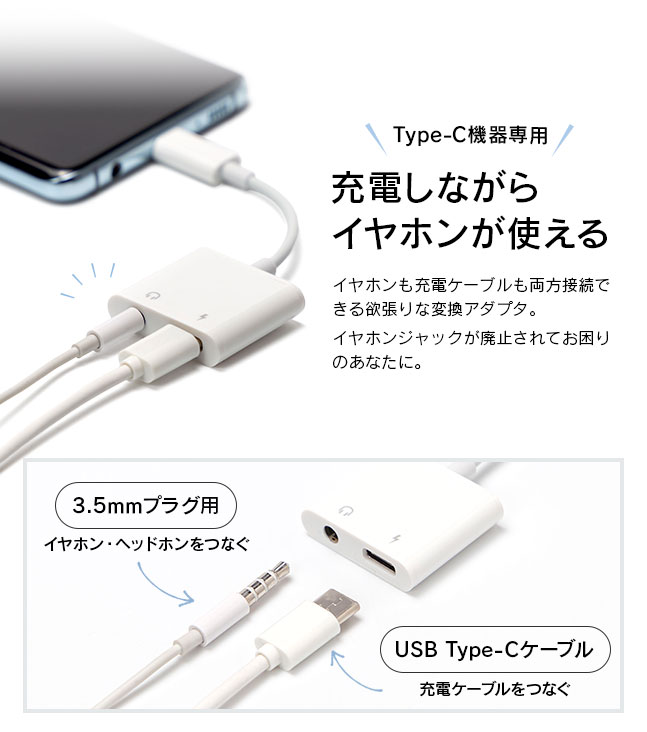★メール便送料無料★【イヤホン変換アダプタ イヤホン変換ケーブル Android Type-C イヤホン 変換 充電 同時 充電しながら 変換 アダプタ 変換アダプタ 変換ケーブル ケーブル 充電器 コード 車 音楽】DAC内蔵型 2in1 イヤホン変換 ケーブル(Type-C) {2} ss