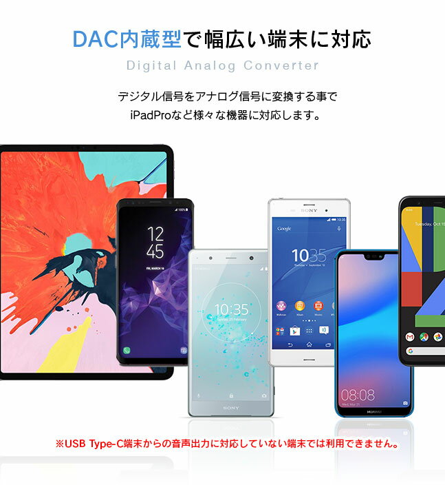 対応機種 ・イヤホンジャックが廃止されたType-Cコネクタを持つスマートフォンなどの端末。