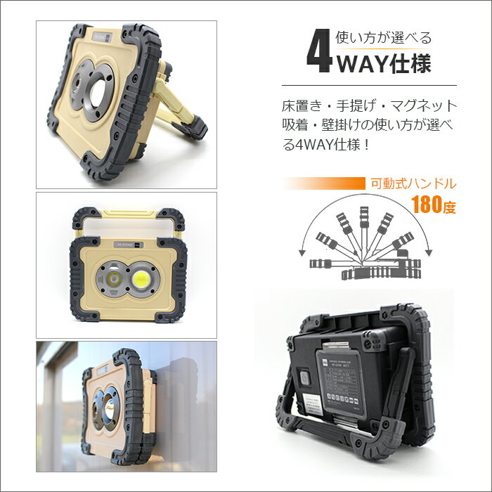 商品情報商品説明 ワイド、スポット切り替えで暗闇の作業が捗る災害時の備えに一つあれば停電時にも十分な明るさ! 防雨仕様だからアウトドアでも大活躍!床置きから壁掛けまで対応する7段階可動式ハンドル! 車の整備やDIY等細かい作業にも最適!商品詳細重量:0.5kg サイズ:W170×D45×H125mm素材:ナイロン・TPR・ABS・ポリカーボネード光束:750lm COB LED搭載色温度:6000-6500K照射角度:ワイド約80° スポット約8°防水等級:IP65使用電池:単三電池(4本)調光機能:HIGH→LOW(2段階)点灯時間:HIGH→約2時間 LOW →約4時間防水等級:IP65 ※日本工業規格(JIS規格)に基づく防塵、防水試験の規格で、粉塵が内部に侵入することがなく、360度の方向から水の噴射を直接浴びても機器本体に有害な影響がない構造のものです。