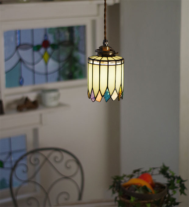 淡いブルーを基調にしたボディと、不規則に形どられた色ガラスはオリエンタルな雰囲気が漂います。