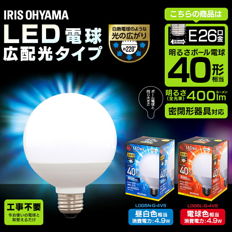●同色2個セット●商品サイズ(cm)直径約9.5×高さ約12.7●商品重量約104g●口金サイズE26●光色相当LDG5N-G-4V5:昼白色相当LDG5L-G-4V5:電球色相当●定格消費電力4.9W●定格入力電流0.082A●全光束400lm●配光角約220°●設計寿命約40000時間●電源100V(50/60Hz共用)●使用場所屋内用●ランプ全体の明るさボール電球40形相当●密閉形器具○※密閉形器具の種類によって、寸法が合わない、熱がこもる等の要因により、使用できなかったり、寿命が短くなる場合があります。